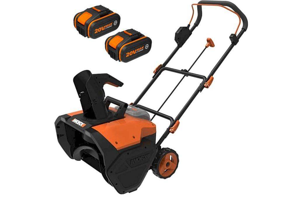 Конструкцией предусмотрено 2 батареи емкостью по 4 Ач. Устройство мощное, что обусловлено бесщеточным двигателем. В темное время суток можно также эффективно убирать снег, как и днем, для этого есть фары. Расстояние выброса снега – 6 м (стандартный параметр). Шнек выполнен из пластика, причем он достаточно прочный, что увеличивает срок службы устройства. Преимуществом снегоуборщика Worxявляется возможность компактного хранения, для чего предусмотрена складная ручка. Это один из лучших электрических снегоуборщиков, стоит 27000 руб.