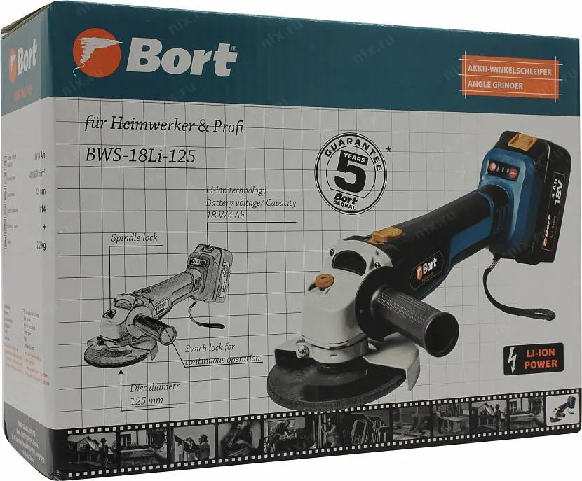 Аккумуляторная болгарка совместимая с дисками диаметром 125 мм. Имеет двухпозиционную прорезиненную ручку, безщёточный электродвигатель, автоматическую систему регулировки и стабилизации скорости вращения круга. Оснащена эффективной защитой от перегрузки и надёжной фиксацией прижимного шпинделя. К достоинствам модели Bort BWS-18Li-125 относят такие признаки: