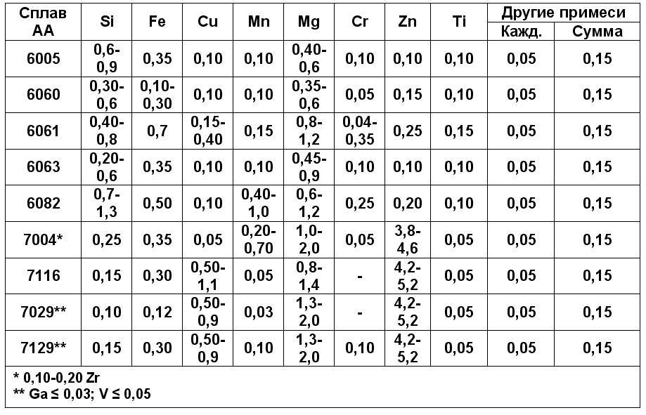 - сплавы серии 7ххх (Al-Zn-Mg): 7004, 7116, 7029 и 7129.