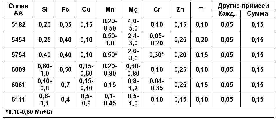 Листовыми алюминиевыми сплавами, которые применяют для панелей кузова, являются нагартовываемые сплавы серии 5ххх (Al-Mg), такие, как сплавы 5182, 5454 и 5754, а также термически упрочняемые сплавы серии 6ххх (Al-Mg-Si), такие как, 6009, 6061 и 6111.