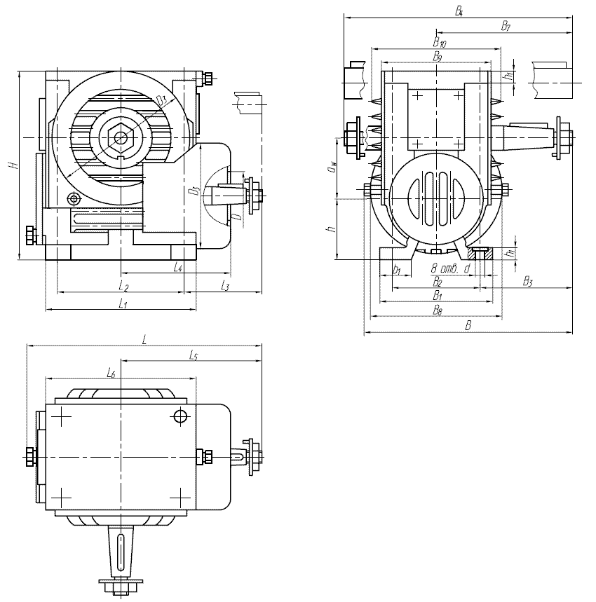 | Типоразмер редуктора | aW | L | L1 | L2 | L3 | L4 | L5 | L6 | l | B | B1 | B2 | B3 | B4 | B5 | B6 | B7 | B8 | B9 |