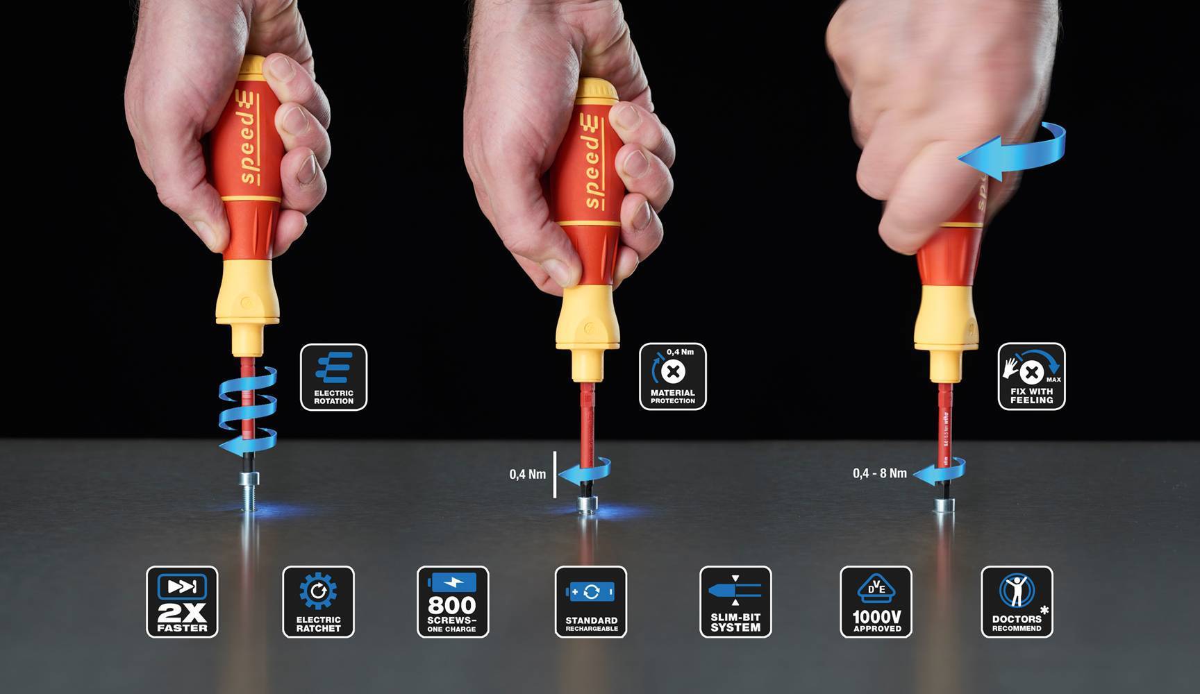 «Завинчивай на скорости, фиксируй с чувством» — под этим девизом, speedE, первая в мире сертифицированная по нормам VDE отвёртка с электроприводом, поднимает планку, обещая своим покупателям удвоить производительность труда. Электродвигатель завинчивает крепеж до достижения усилия 0,4 Нм, обеспечивая максимальную защиту закрепляемых материалов от повреждения, после чего винт можно затянуть вручную с нужным усилием, так же, как при работе с обычной отвёрткой. Инновационный электрический храповой механизм, помогает сделать это, не снимая отвертки с крепежа. Уникальный трехступенчатый процесс SpeedE обеспечивает значительно более быструю, эффективную, но при этом, точную и безопасную работу.