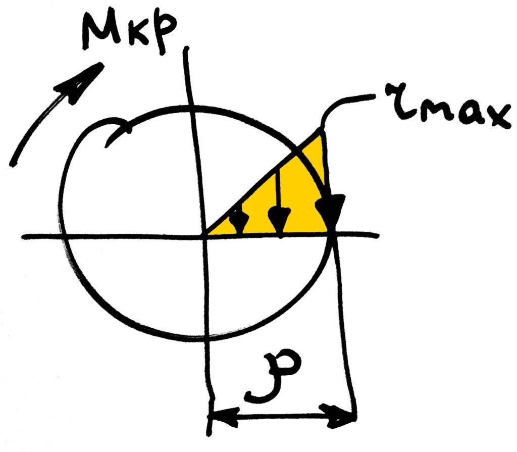 где Ip — полярный момент сопротивления, ρ — радиус круга. Причем по этой формуле можно определить касательное напряжение в любой точке сечения, варьируя значение ρ. Касательные напряжения распределены неравномерно по сечению, их максимальное значение находится в наиболее удаленных точках сечения: