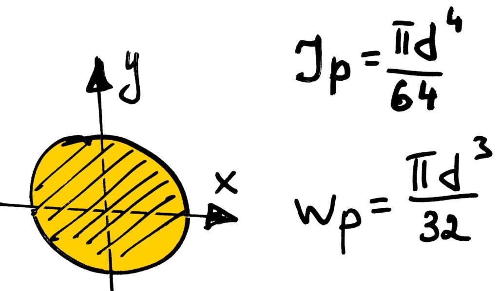 То бишь максимальные касательные напряжения равны отношению крутящего момента к полярному моменту сопротивления и должны быть меньше либо равны допустимому напряжению. Геометрические характеристики для круга, упомянутые выше можно найти вот так: