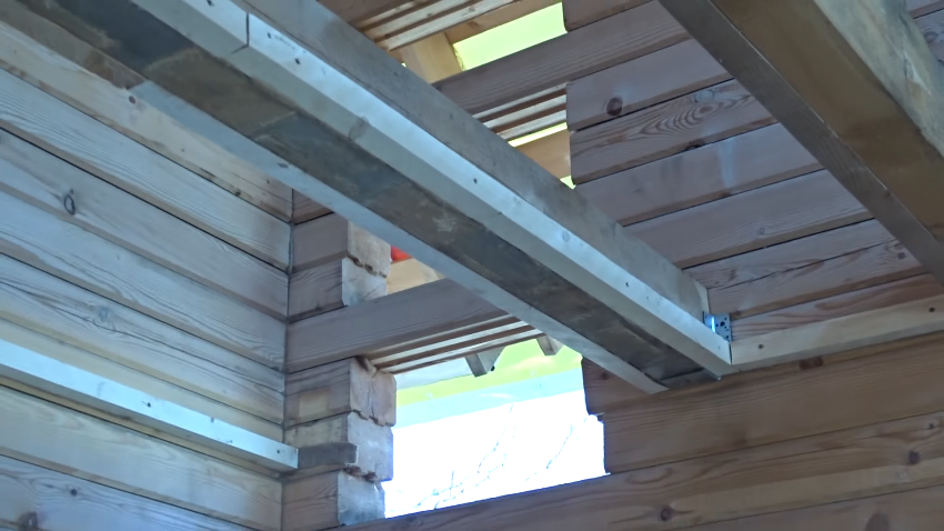 Опоры укладывают с шагом не менее 60 см. Если балки крупного сечения, расстояние между ними увеличивают до 1 м. Монтаж перекрытия начинают от одной из коротких стен дома. Брусья (бревна) должны быть уложены перпендикулярно длинным стенам.