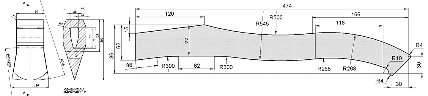 Топор-колун прошел длительную эволюцию и продолжает совершенствоваться. Справа на рис. дан чертеж колуна Стрела, приспособленного для ручной колки суковатых и свилеватых кряжей; слева – топорища для него (колун на нем крепится клином). С топорищем как хотите, нравится вам махать топором или нет, а вот самый колун нам еще очень пригодится, см. далее.