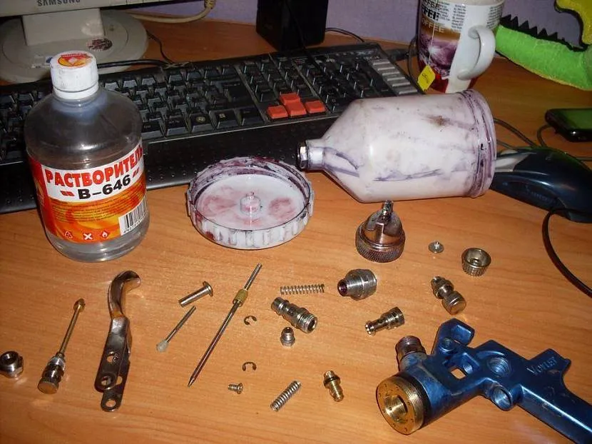 - Необходимо вынуть съемные элементы. В зависимости от модели это: сопло, пластиковая накладка, металлический стержень, пластиковая трубка для забора краски.