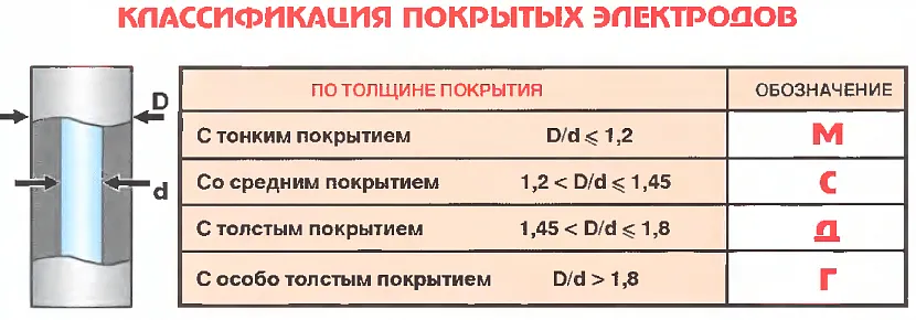 М – с тонким покрытием (соотношение D/d не более 1,2). С – со средним покрытием (соотношение D/d в пределах от 1,2 до 1,45). Д – с толстым покрытием (соотношение D/d в пределах от 1,45 до 1,8). Г – электроды с особо толстым покрытием (соотношение D/d более 1,8).