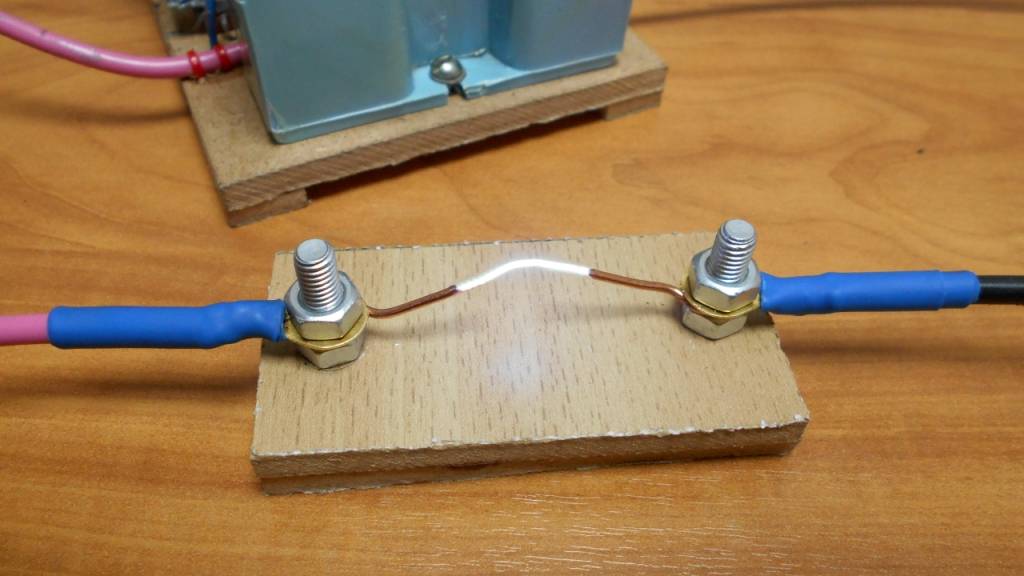 Для высокого значения тока необходимо использовать медные провода сечением 8…10 мм². Чтобы прожечь отверстие, электрод изготавливают из толстой латунной проволоки. Чтобы запустить непрерывный процесс работы, нужно с частотой около 1 Гц подводить электрод к обрабатываемой детали.
