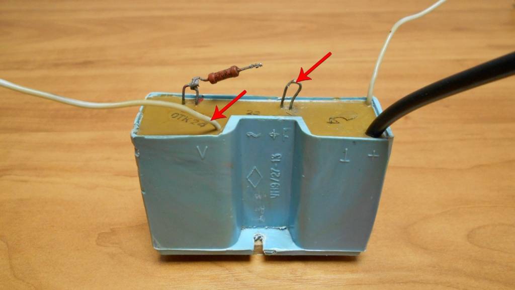 Умножитель напряжения УН9/27-13 или аналогичный тоже нуждается в незначительной доработке. На нем надо удалить два неиспользуемых вывода, отмеченных на картинке красными стрелками, потом изолировать эти места «поксиполом». Делать это необязательно, но если вы случайно во время эксперимента коснетесь этих выводов… Волосы встанут дыбом и мало не покажется, конечно током не убьет, там очень мало ампер, но обжечь может. Между строчным трансформатором и умножителем устанавливается резистор на 470 ом.