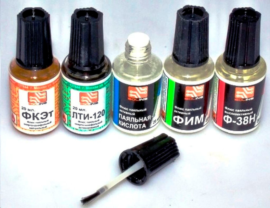 Флакон снабжен пробкой со вставленной кисточкой для удобного нанесения. Почти все эти жидкие смеси великолепно удаляют пленки, затрудняющие пайку. А это значит, что они активные и необходимо тщательно удалять их остатки, протирая место пайки. Не забываем о вредном воздействии паров на организм. Если нет вытяжки, надо паять на балконе или на подоконнике у открытого окна. Тут же и смываем остатки, если используется растворитель, бензин или ацетон.