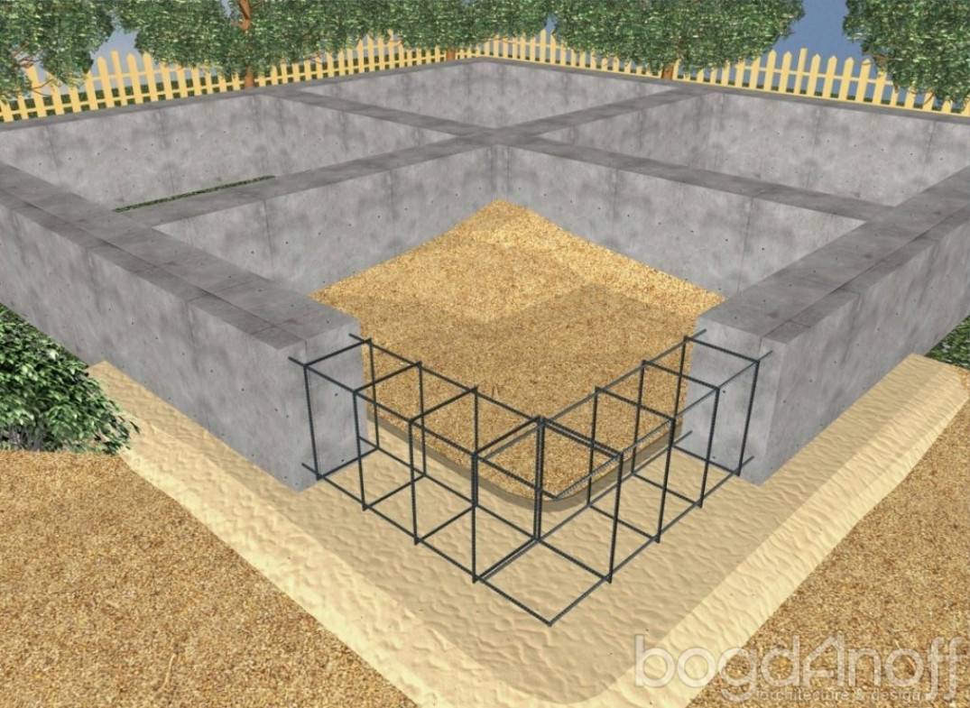 создание ребер жесткости под ростверк: из арматуры толщиной 10-16 мм, связанной прямоугольными хомутами 6-8 мм с шагом 300 мм, укладываются каркасы с учетом защитного слоя бетона;