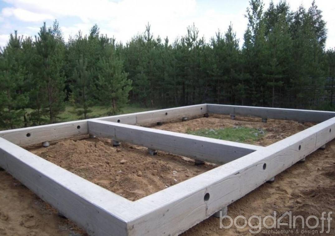 Для свайно-ростверкового фундамента надо выкопать ямы, до уровня промерзания почвы и соединить их перешейками. Затем в ямы и канавы заливается бетон и получается бетонная лента, из которой выходят столбы, опирающиеся на почву ниже уровня промерзания.