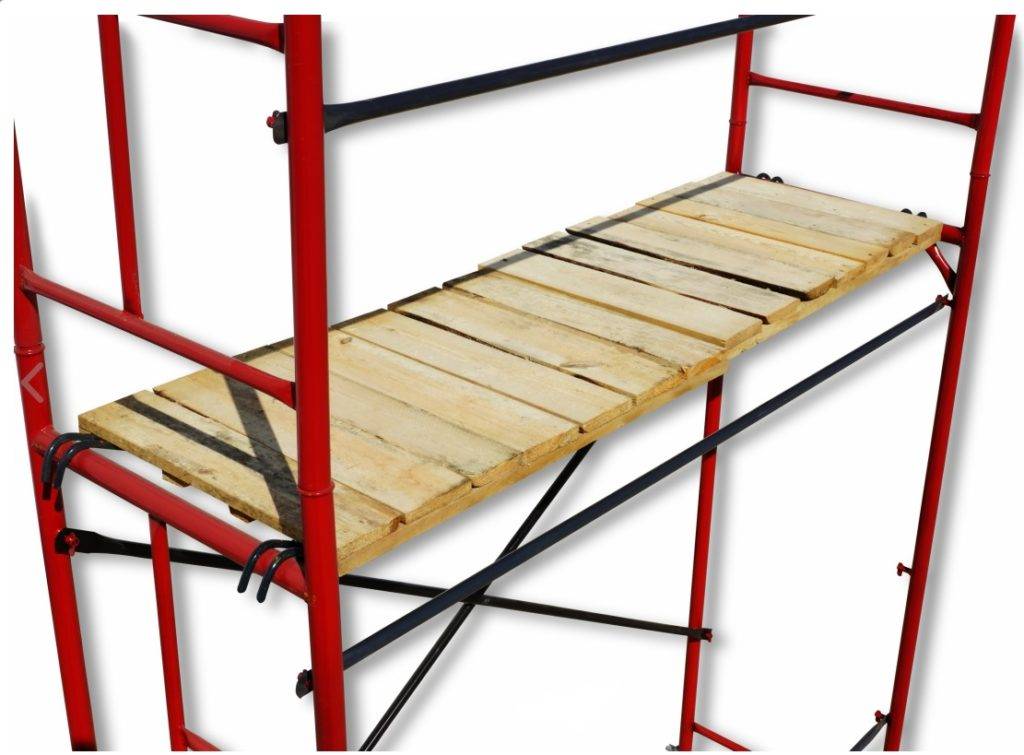 Модель относят к рамному типу с флажковыми замками. Благодаря им при сборке нет нужды прибегать к использованию дополнительных инструментов. Профессионалы, знающие, что делают, собирают в течение 7 минут. Опора избавит от применения стремянки на уровне 4 метров. На ней удобно размещать материалы и инструменты для дальнейших манипуляций. В основе конструкции лежат металлические профили с толщиной стенок 1.2 мм. Допустимая нагрузка доходит до 20 кг/м2. Другими словами способно выдержать одновременно стоящих 2 человек. Жесткость и устойчивость на достойном уровне.