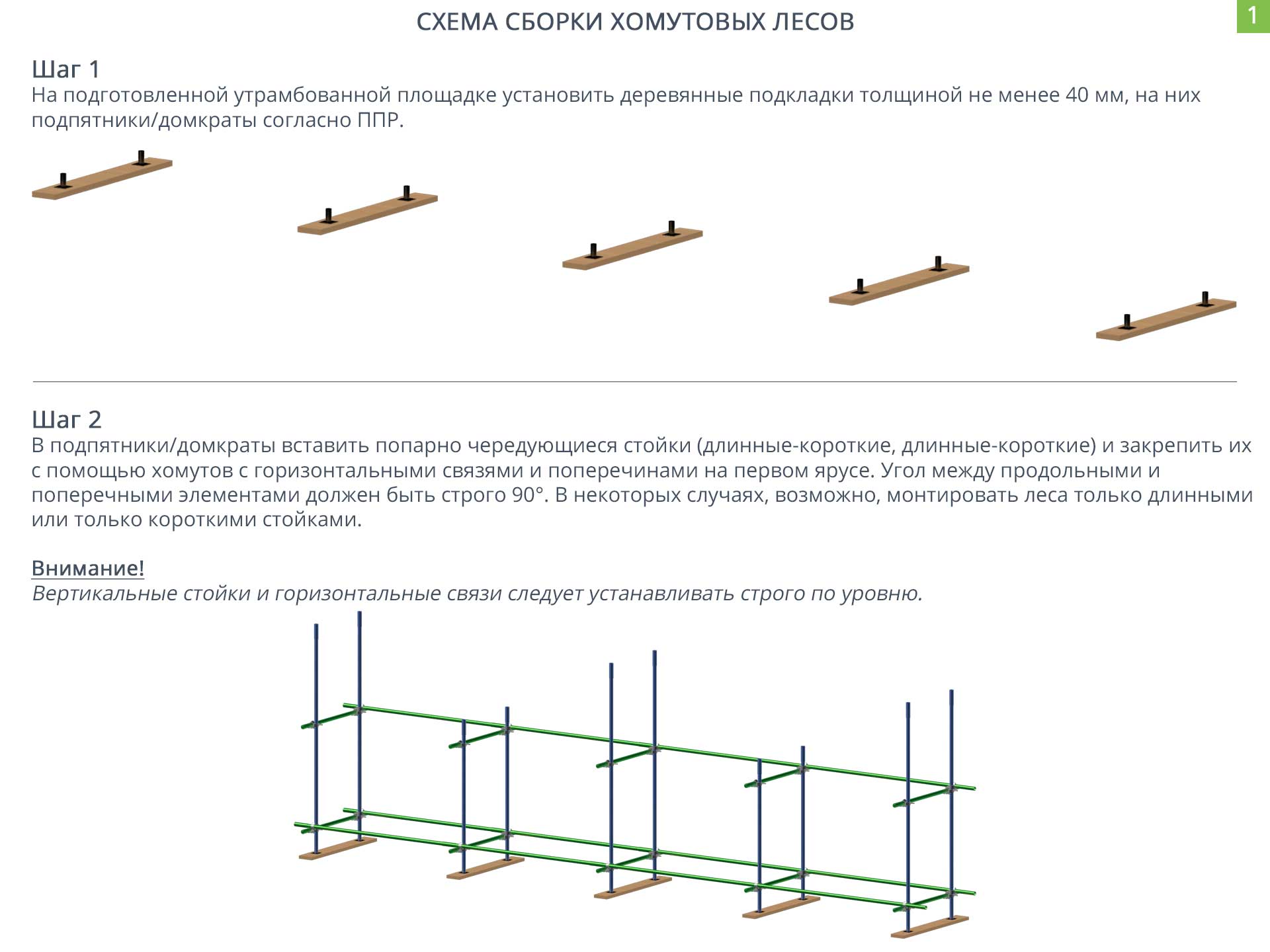 Перед сборкой лесов необходимо проверить их комплектность и наличие документов: технический паспорт, инструкцию по сборке, журнал периодических испытаний конструкции на прочность. Порядок установки хомутовых лесов: