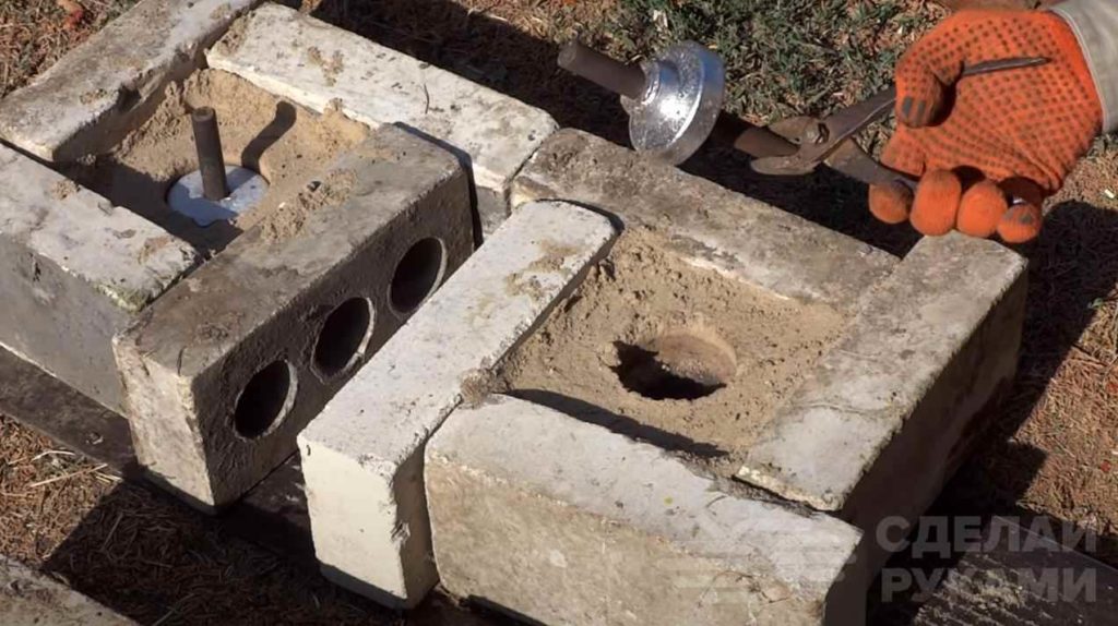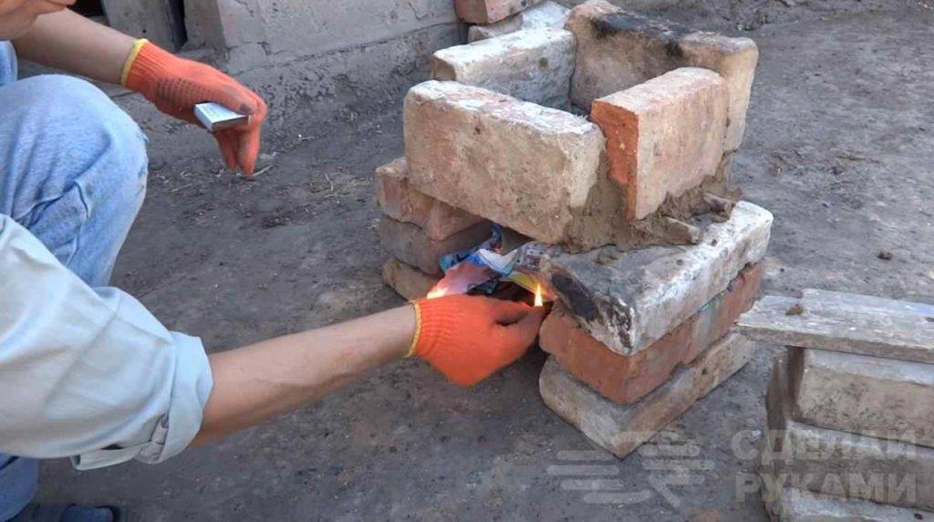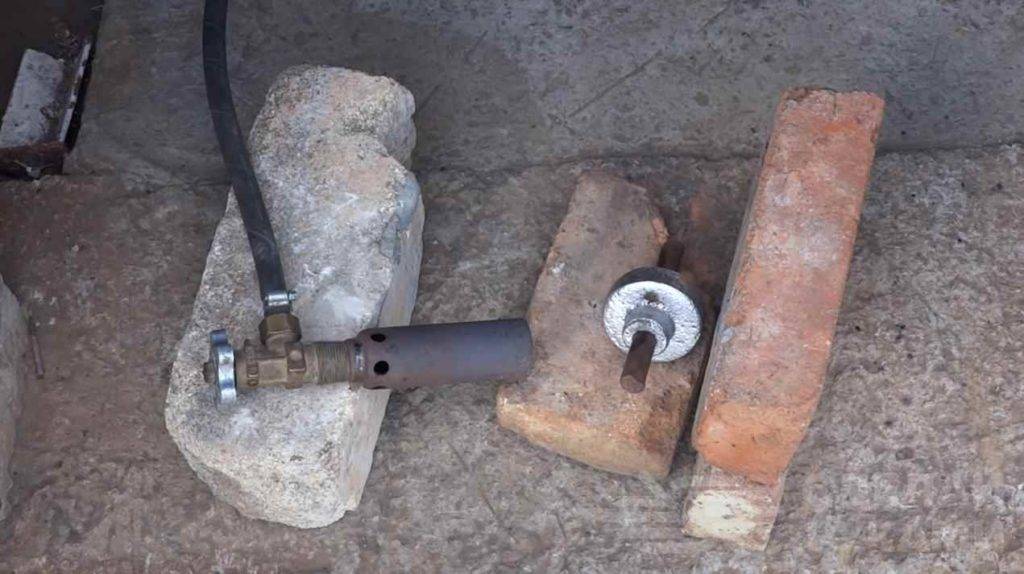 На следующем этапе автор на скорую руку собирает печь из кирпичей. Щели замазываем глиной. Сам тигель для плавки алюминия можно изготовить из корпуса стартера от автомобиля.