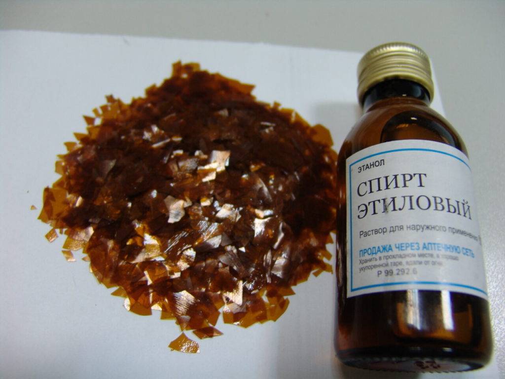 Одна из самых популярных политур – шеллачная. Она имеет простой состав, поэтому такую политуру можно приготовить самостоятельно. Для этого 650 мл этилового спирта с концентрацией от 90% до 95% смешивают со 115 г размолотого шеллака. Этиловый спирт можно заменить винным, но правильнее брать медицинский спирт высокой степени очистки.