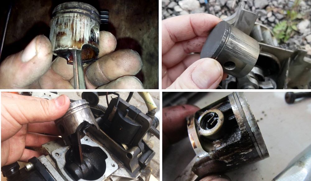 - Если бензин будет разбавлен с большим количеством масла (выше нормы), то это приведет не только к возникновению большого количества дыма, но еще и к образованию нагара на стенках цилиндра и падению мощности. Этот нагар станет причиной износа поршня, что будет диагностироваться по снижению его производительности