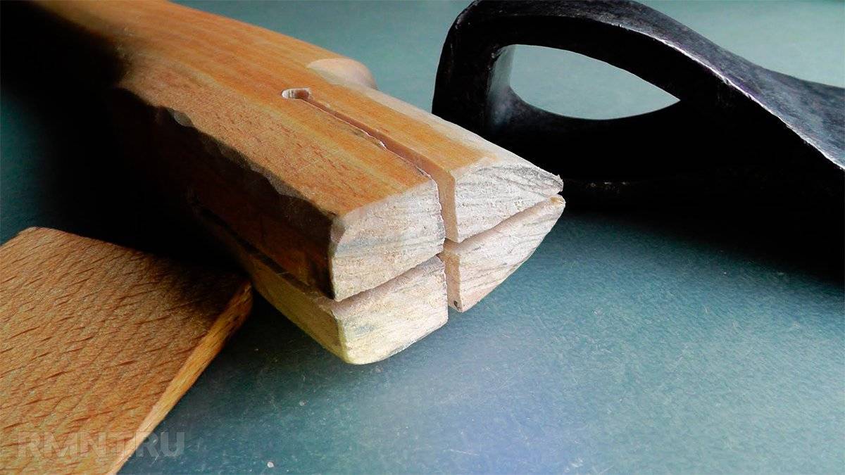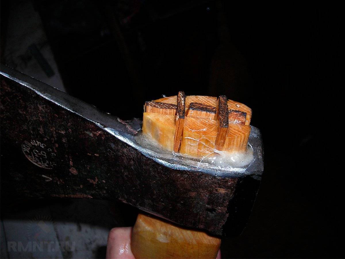 Забивать клинья можно резиновым или деревянным молотком, выступающие части отпилить. Главная опасность на этом этапе — расколоть топорище, слишком сильно загоняя клинья.