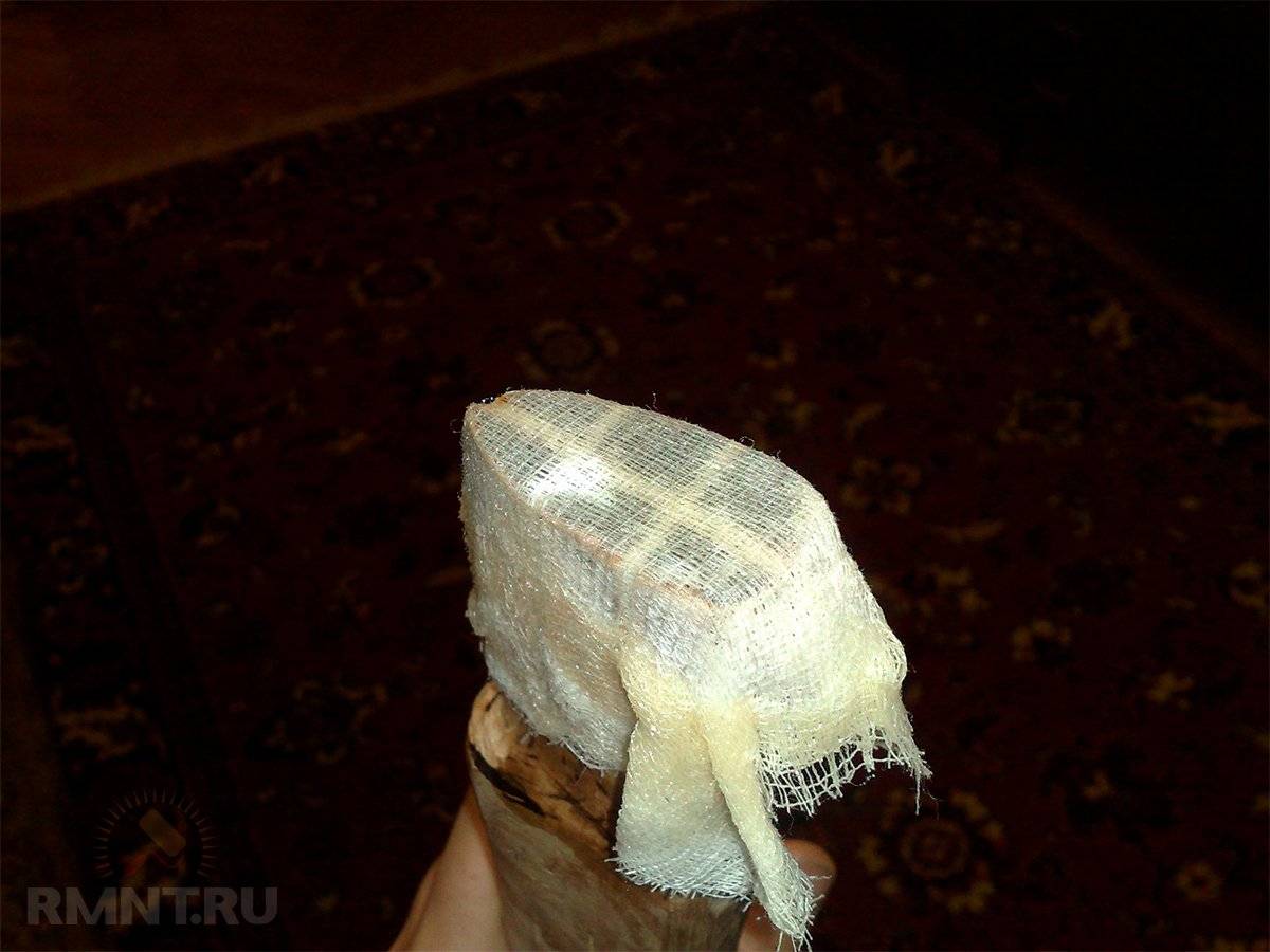 Перед тем, как насадить лезвие на топорище, следует наложить два-четыре слоя марли, пропитанной эпоксидной смолой, которая отлично заполнит все неровности. Торчащие, лишние куски марли обрезаются. Клинья перед вставкой в вырезанные пазы тоже смазываются эпоксидкой. Смолу целесообразно налить и в сами пазы, примерно на четверть. Делается это уже после насадки топора.