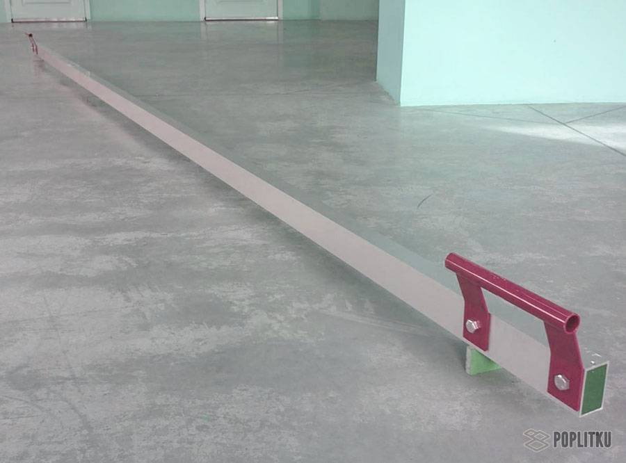 Сухая выравнивающая смесь замешивается с водой и укладывается между маяками. Затем плавными скользящими движениями правила по маякам смесь выравнивается.