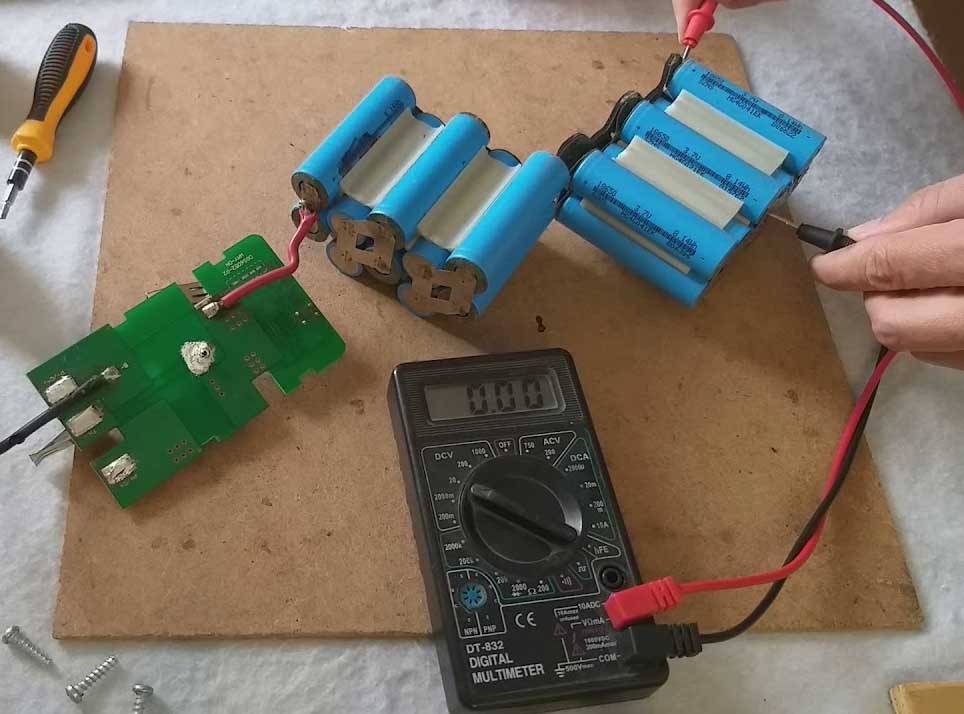 - когда отсутствуют поврежденные банки (потекшие либо вздутые), тогда проверяют мультиметром напряжение на выводах каждой батареи, предварительно с помощью паяльника распаяв цепь;