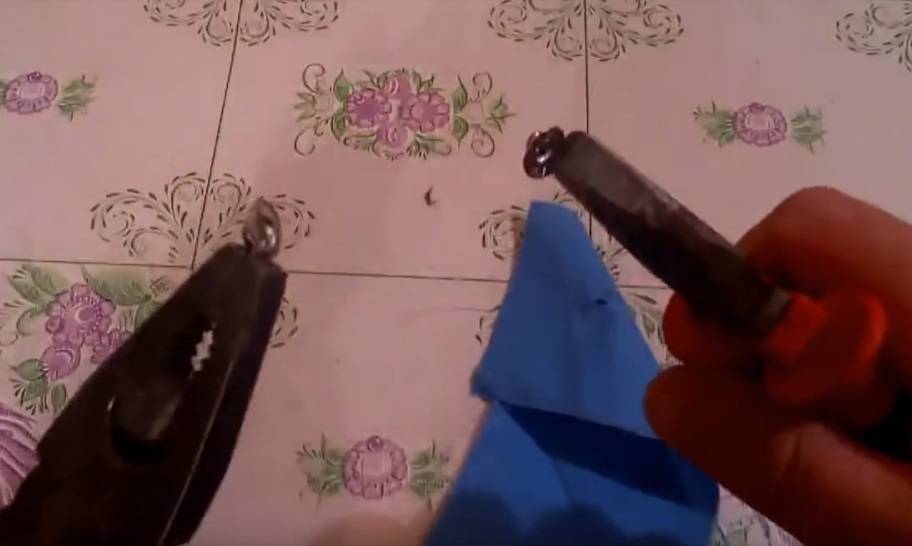 - Возьмите бокорезы (желательно орудовать теми, что на плоскогубцах), установите их под самый низ расширенной части и сожмите.
