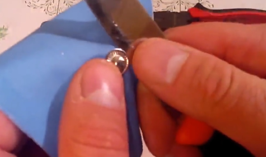- Аккуратно, чтобы не повредить ткань, вставьте острое лезвие ножа под край широкой части заклепки с одной стороны и отогните его так, чтобы за край можно было схватиться плоскогубцами.