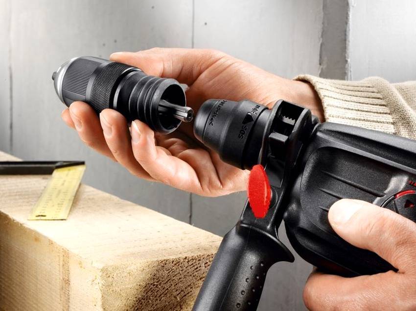 Если необходимо поместить в перфоратор сверло от обычной дрели (например, модели Интерскол), придется применять специальный адаптер. Это обычный патрон, который используется на электродрели. Их также разделяют на быстрозажимные или ключевые. В патрон вставляется специальный переходник (далее — надежно зажать), с одной стороны которого имеется резьба, а с другой — хвостовик как у стандартного бура.