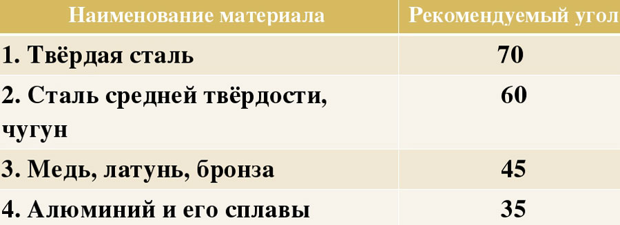 - 45 градусов для мягких материалов (латунь, медь);