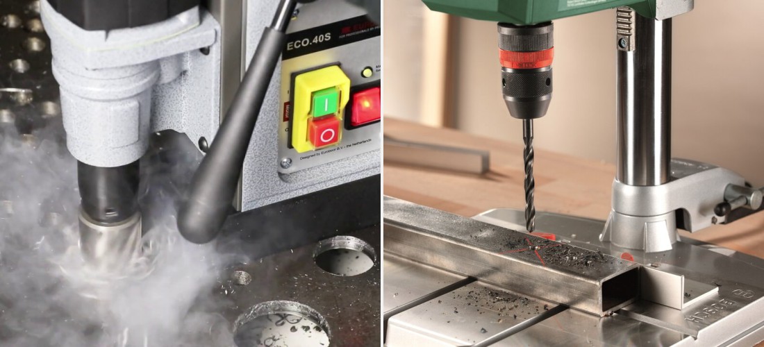 При выборе инструмента для работы со спиральными сверлами, необходимо быть особенно внимательным. Производители часто указывают максимальный диаметр корончатого сверла, а этот режущий инструмент имеет более высокую производительность. Оборудования, рассчитанное на работу со сверлами большого диаметра, должны иметь систему подачи охлаждающей жидкости.