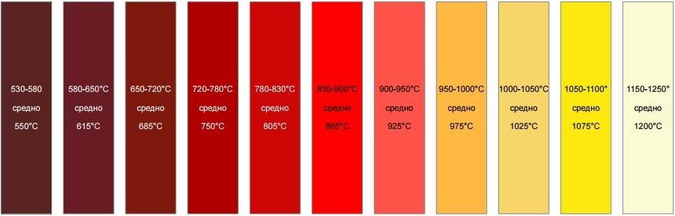 Есть специальный аппарат – пирометр – он напоминает градусник, но измерения проводят без непосредственного контакта. Он дорогостоящий, поэтому для домашней работы покупать его не стоит. Посмотрим таблицу цветов, как по ней определять температуру: