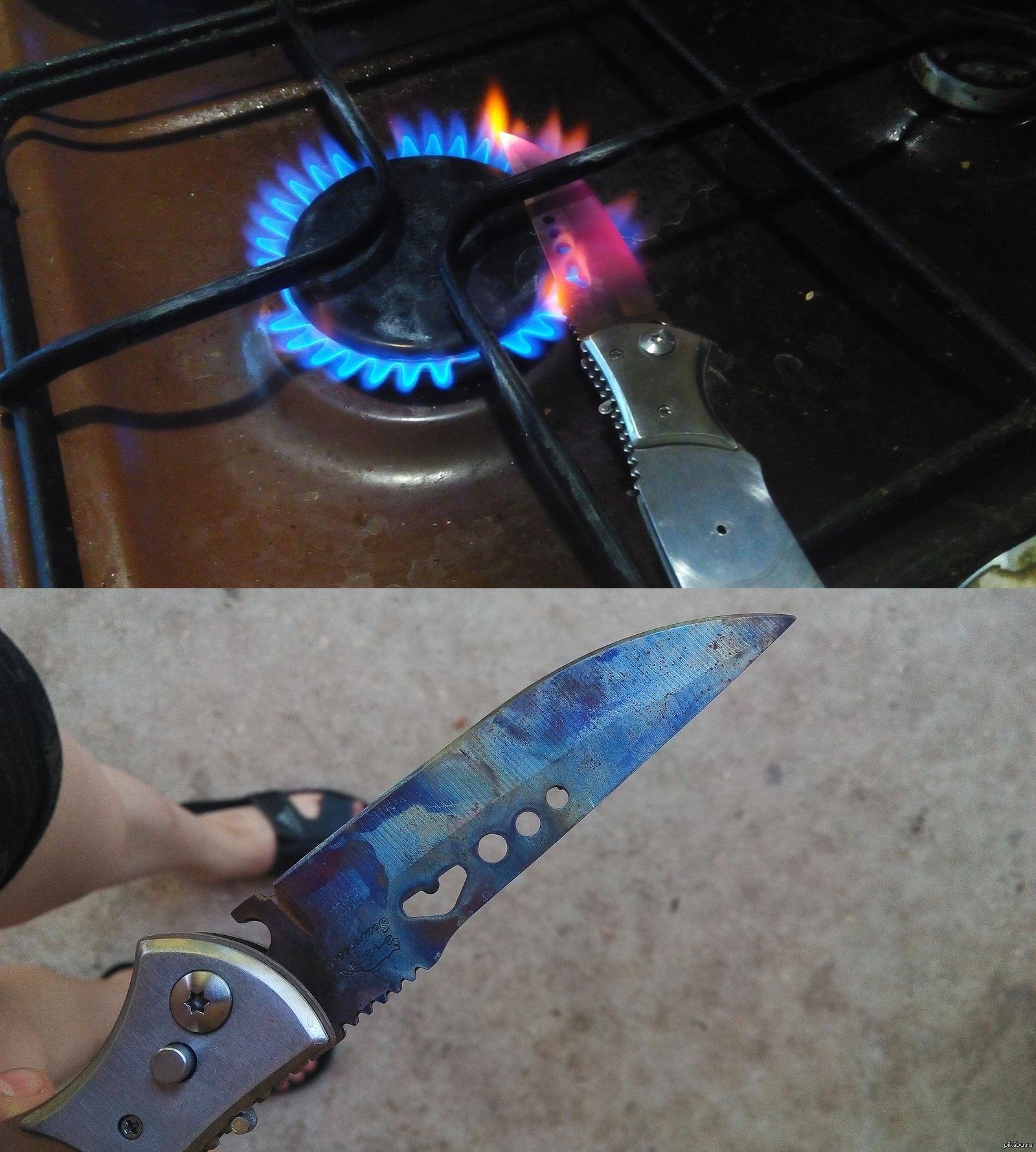 Красный цвет свидетельствует о нагреве до 720-950 °С. Малиновый или светло-вишневый оттенки стали означают, что температура разогрева соответствует 800-850 °С. Появление в пламени бордового цвета свидетельствует о том, что лезвие накалилось недостаточно, лишь до 650-720 °С, коричневого – температура не выше 530-580 °С.