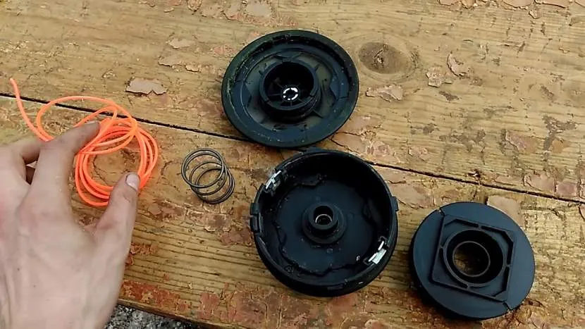 - небольшие электрические триммеры с рабочим расположением двигателя и катушки в нижней части, как правило, имеют по обеим сторонам бобины боковые клавиши. При одновременном нажатии на них верхняя часть катушки вместе с внутренним содержимым для намотки лески отсоединяется, в то время как нижняя остаётся на триммере. Разбор шпульки желательно производить на ровном гладком месте, чтобы входящая в конструкцию пружина не выскочила и не потерялась;