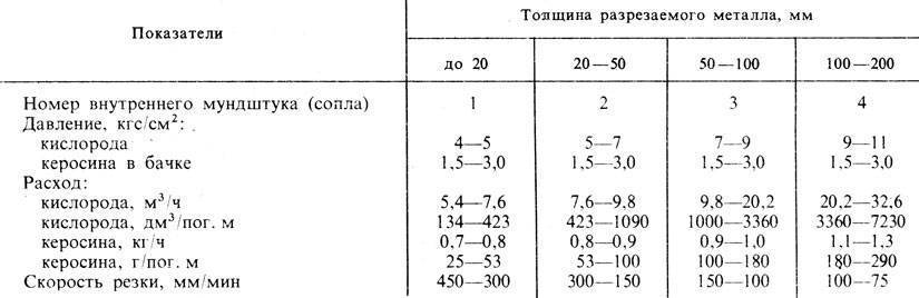 Сменными мундштуками регулируют фас-ход кислорода, керосина и скорость резки в зависимости от толщины разрезаемой стали (табл. 18).