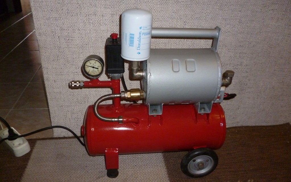 На собранной раме (например, прочная доска на колёсиках или конструкция из прочных уголков, труб) крепим баллон, а на него или рядом — мотор-компрессор, проложив резиновую прокладку. К входящей воздушной трубке компрессора подсоединяем сначала бензиновый, а затем дизельный фильтр. Это нужно сделать, если компрессор предназначен для работы аэрографа, чтобы исключить малейшее загрязнение воздуха. А так как фильтр на дизель более «тонкий», его устанавливают после бензинового. Если медные трубки при демонтаже потеряли форму — нужно их развальцевать.