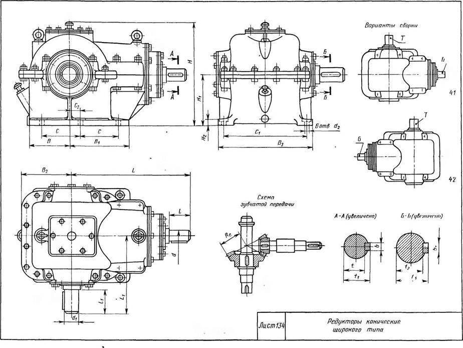 Габаритные и присоединительные размеры конических редукторов (листы 133,134), мм