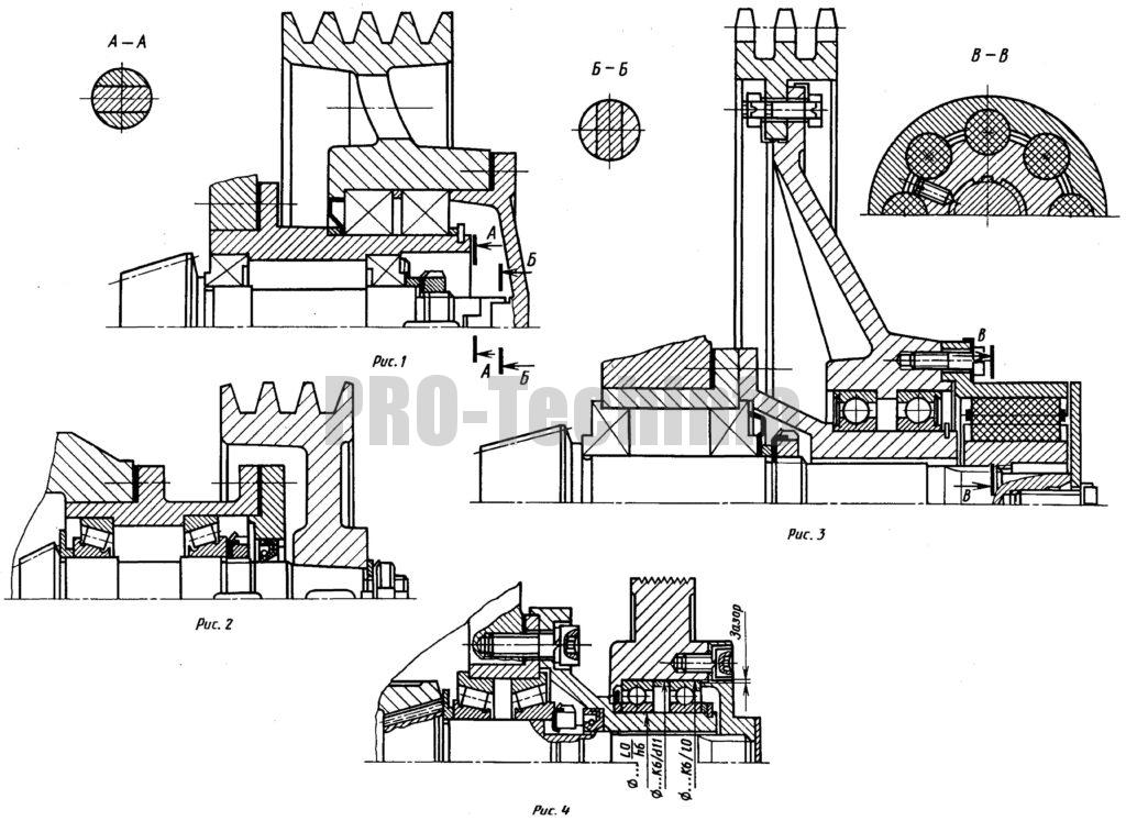 Рис. 1, 3, 4 — подшипники вала шестерни и шкива (звездочки) раздельны. Шкив (звездочка) опирается через два своих подшипника на стакан. Вал разгружен от сил натяжения ремня, крутящий момент со шкива (звездочки) передается или через упругую муфту и шлицы (рис. 3), или через жесткую компенсирующую муфту (рис. 1), или через шлицы (рис. 4).