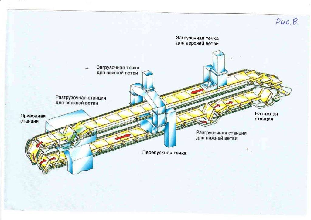 грузонесущим органом конвейера являются ковши, ось подвеса которых проходит по средней точке, что позволяет им качаться; для транспортировки сыпучих материалов (угля, щебня, шлака, клинкера) ковши устанавливаются с перекрытием без зазоров, в отличие от механизмов для перегрузки самотёком, по типу нории.состоит из кольцевой ленты, натяжного и приводного барабанов и опорных роликов; применяется обычно для транспортировки сыпучих веществ, возможны модификации (трубчатый, z-образный, поворотный на 90 и 180 градусов), связанные с деформацией ленты.