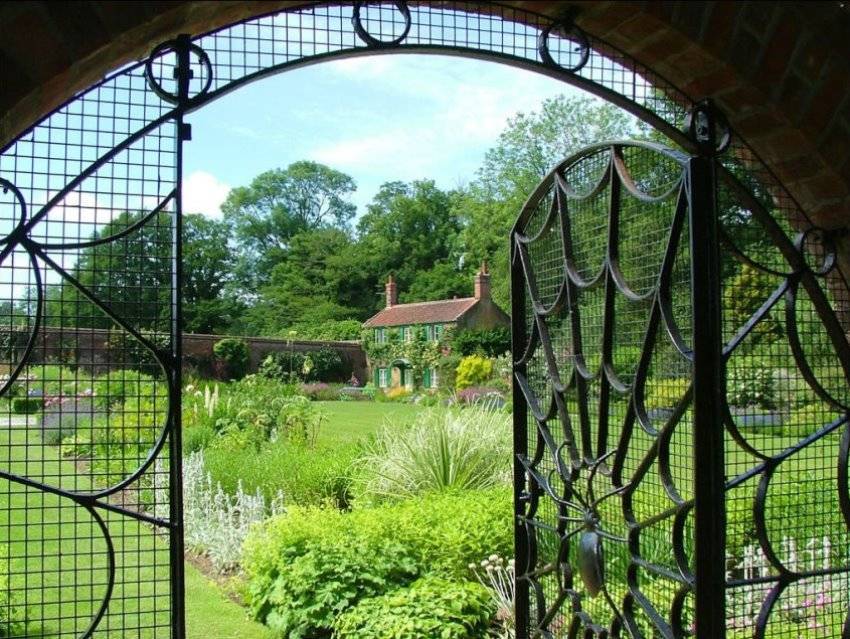 - Живая изгородь в сочетании с коваными воротами придаёт загадочность и оригинальность входной группе участка, особенно если эта изгородь формованная. Но и простое переплетение вьюнов также может придать участку неповторимый вид сказочной усадьбы.