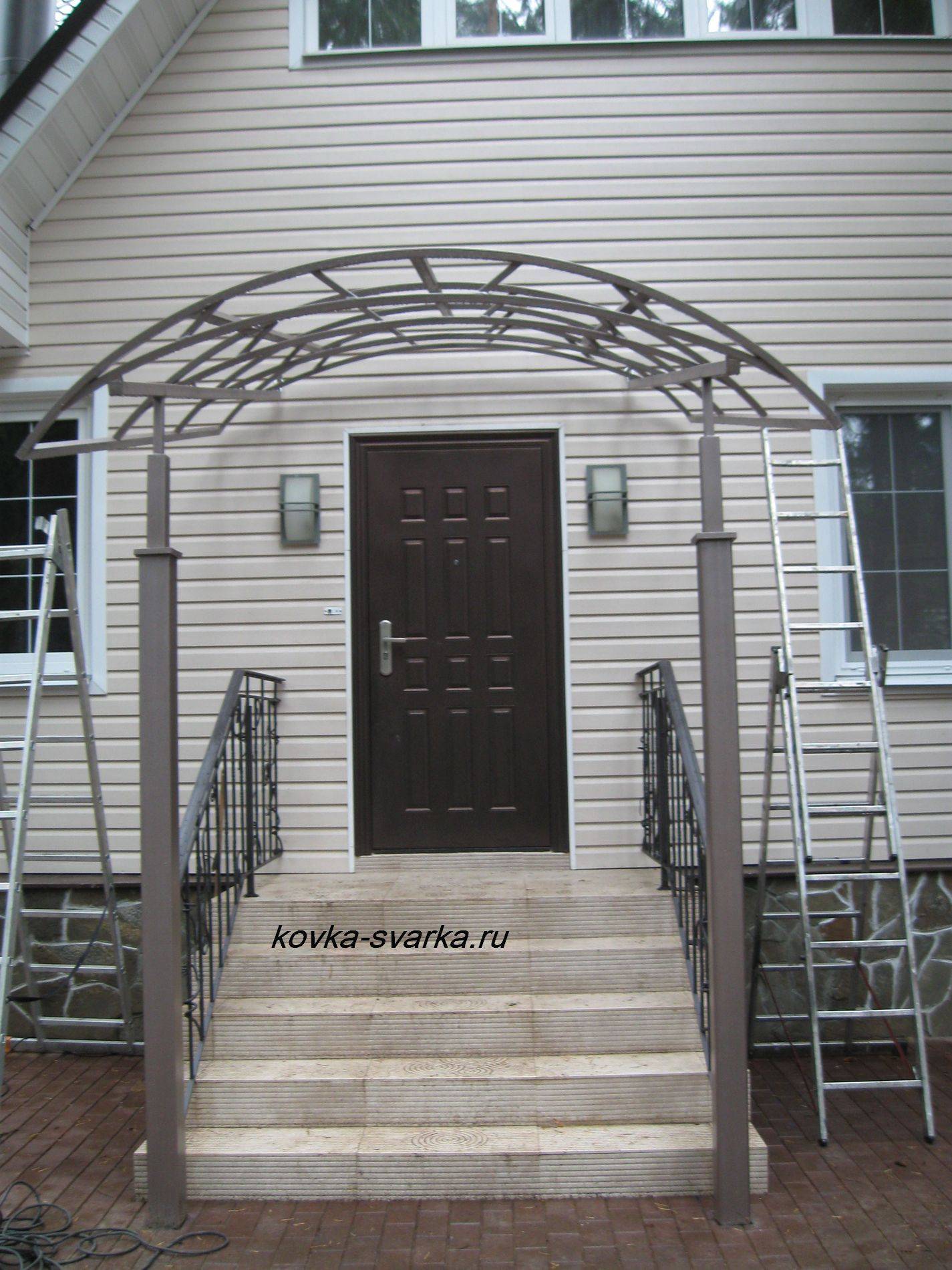 Кованые козырьки в виде арки имеют изящный вид. Существуют конструкции с более или менее выраженным изгибом.