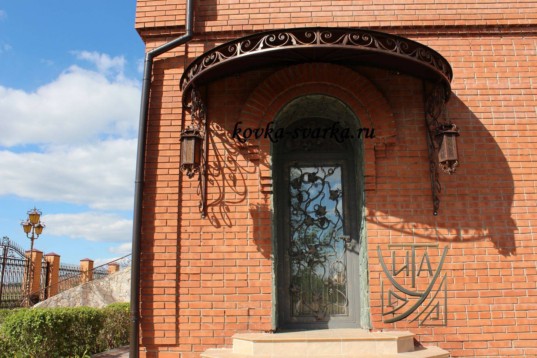 Крыльцо является придомовой пристройкой, обеспечивающей завершенный вид фасаду и гарантирующий удобство передвижения при входе-выходе из дома. Для защиты крыльца от погодных воздействий и декорирования экстерьера рекомендуется использовать кованые козырьки. Металлические сооружения над крыльцом могут иметь разнообразные формы. Возведение на крыльце ограждений и перил позволит получить единую композицию, которую принято называть «входная группа».
