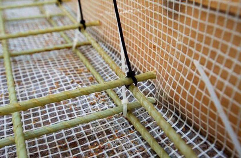 Чтобы решить такую проблему со стеклопластиковой арматурой, надо привязать несколько раскосов, чтобы конструкция стала более жёсткая и устойчивая. Прогибаясь, натяжка в местах вязки изменяется, каркас гуляет. Поэтому при установке его в опалубку нужно быть осторожными. Лучше вязать арматуру в опалубке или над ней, если выполняется армирование ленточного фундамента.