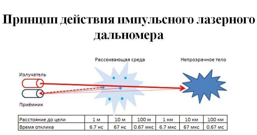 Если тот же метод применить со световым импульсом, получится точный лазерный дальномер импульсного типа. Дело в том, что скорость света настолько высока (300 000 км/с), что для небольших расстояний, которые измеряются в строительстве (20, 30, 50 м), речь идет о долях наносекунд. Измерить время с такой точностью очень сложно.