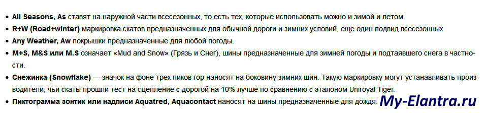 - R+W (Road+winter) маркировка скатов предназначенных для обычной дороги и зимних условий, еще один подвид всесезонных