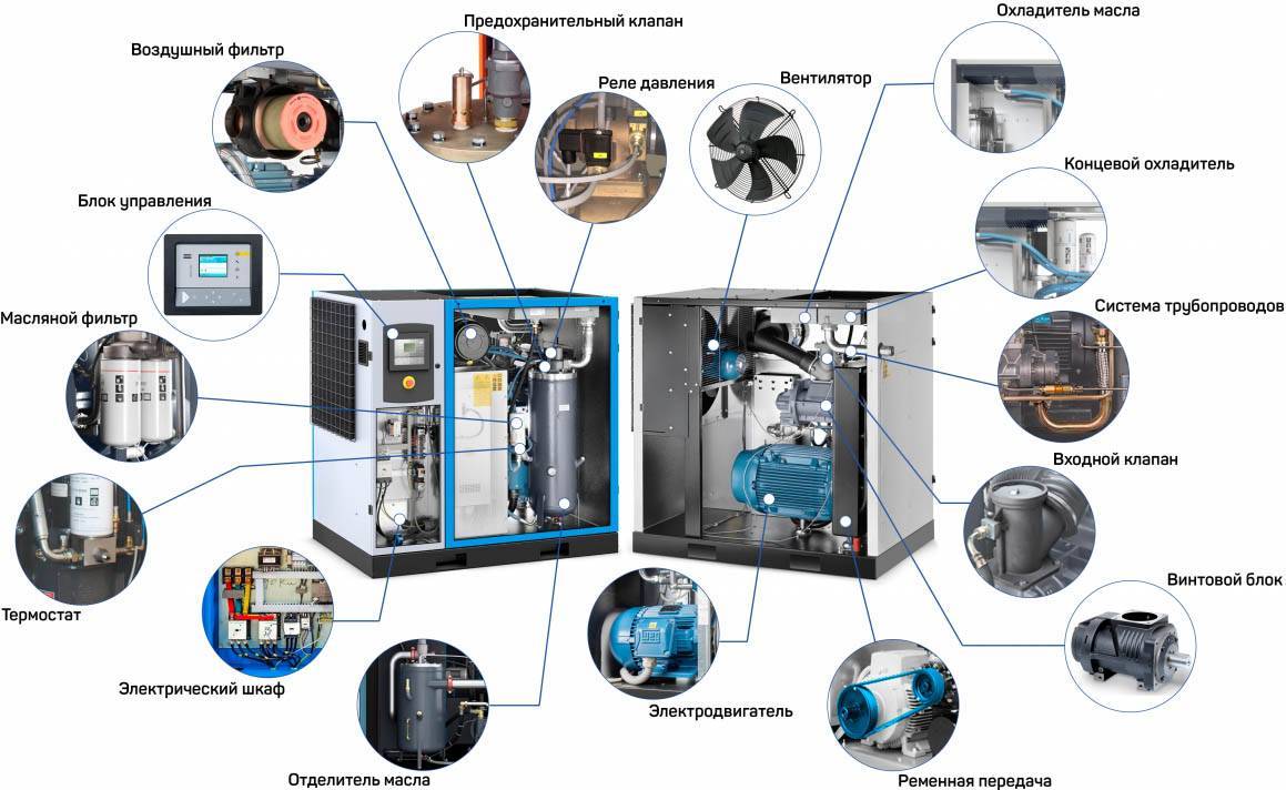 Стандартная комплектация любого винтового компрессора (основные элементы):