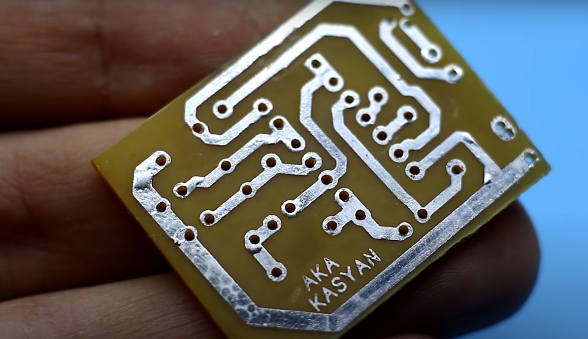 Для размещения радиодеталей используется печатная плата, которую легко изготовить своими руками. Для этого мы используем кусок фольги гетинакса, покрытый медной электроизоляционной фольгой. Переносим на него соединительные детали, размечаем точки крепления, просверливаем отверстия. Покрываем дорожки защитным лаком и после высыхания опускаем будущую доску хлорного железа для гравировки. Это необходимо для удаления незащищенных участков медной фольги.