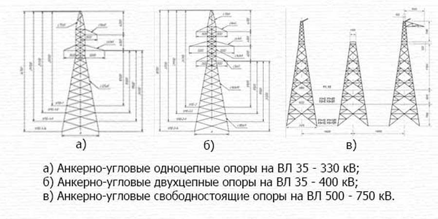Выделяют такие основные типы опор ВЛ – анкерные и промежуточные. Различие между опорами этих типов состоит в способе подвески проводов.