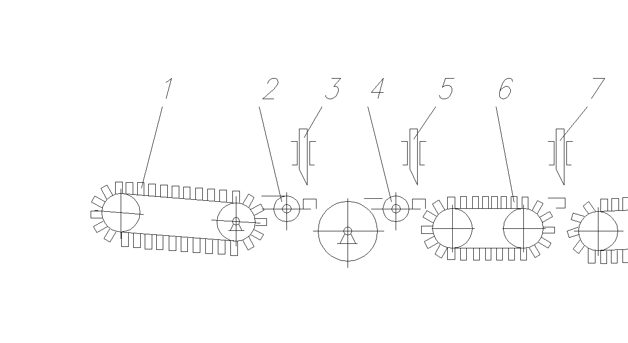 Питающие транспортеры 13 и 14 приводятся от ведомого вала питающего транспортера 15 посредством нескольких цепных передач через обгонные муфты, установленные на ведущих валах передач.