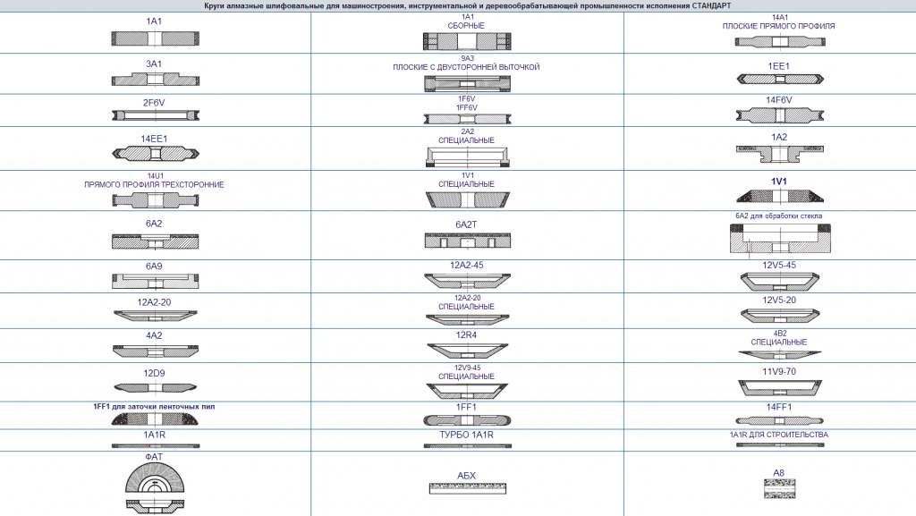 Заточные круги алмазные по назначению пользуют для заточки пил изготовленных из твёрдых сплавов, с их помощью выполняют доработку напаек, они незаменимы при заточке токарных резцов и т. д. У них мелкая структура, позволяющая выполнить отделку обрабатываемого изделия, что невозможно сделать, используя рядовой стандартный абразивный наждак.Диски шлифовальные разных видов, типов алмаза и зернистости на механических и органических связках используют для доработки и заточки токарных резцов, фрез и других приборов из твердого сырья. Российский рынок алмазных кругов представлен изделиями разнообразной формы:
